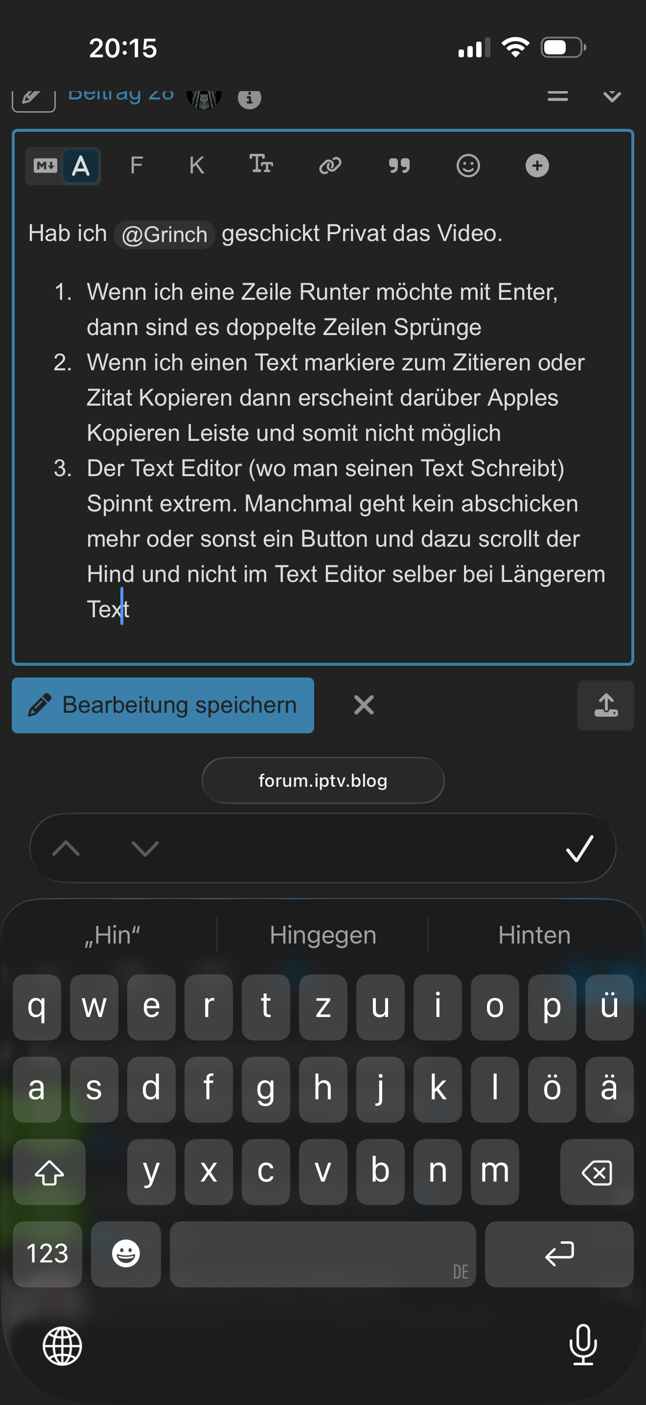 - Wenn ich einen Text markiere zum Zitieren oder Zitat Kopieren dann erscheint darüber Apples Kopieren Leiste und somit nicht möglich