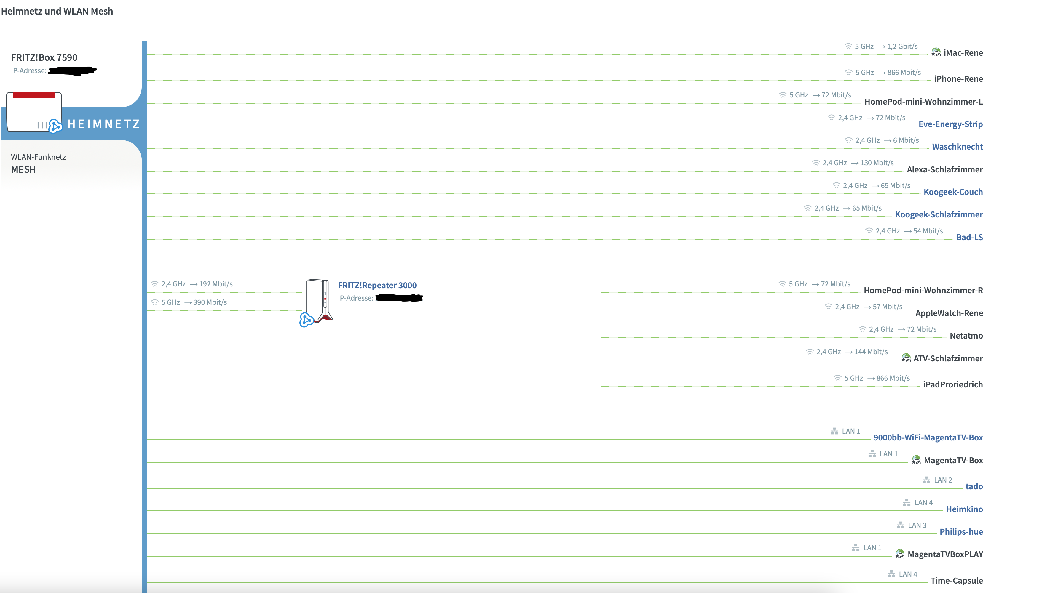 Hin und wieder macht so ein Netzwerk ja auch komische Dinge. Weshalb der eine HomePod nun eisern über den Repeater im Schlafzimmer verbunden wird? Beide HomePod stehen im Wohnzimmer und dies auch noch sehr dicht beim Router…