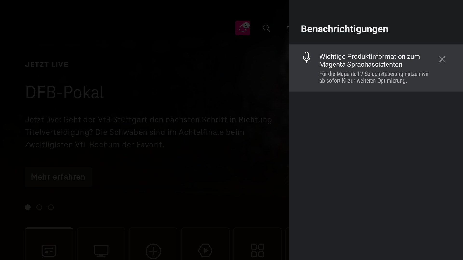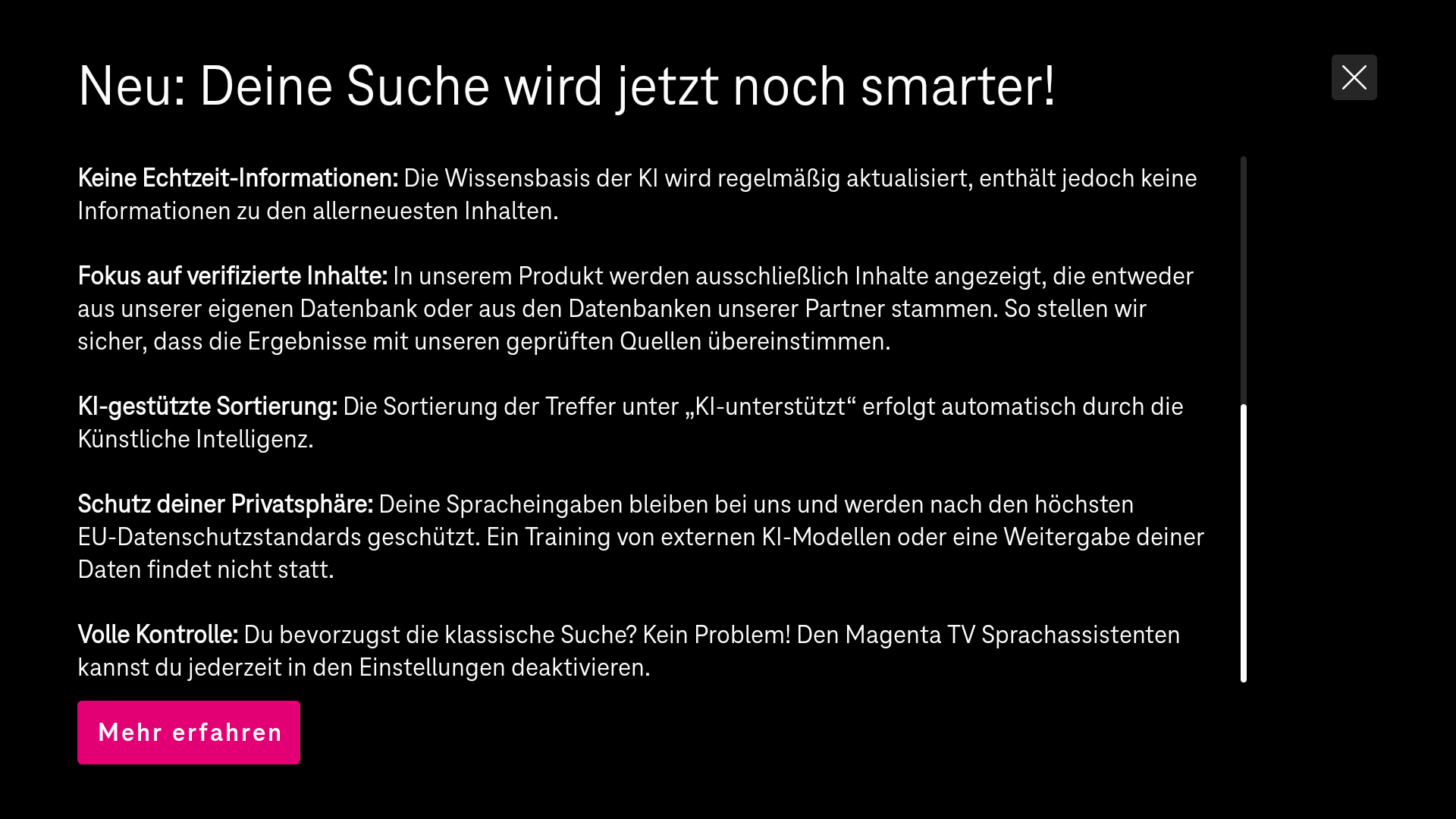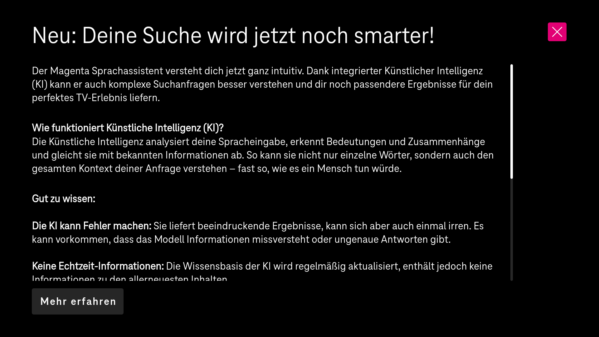 Über die Glocke gestern beim Stick (v2), heute auf der One (v2): „Für die MagentaTV Sprachsteuerung nutzen wir ab sofort KI zur weiteren Optimierung.“