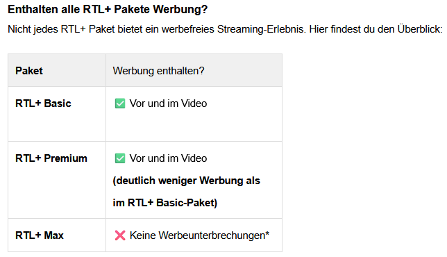 „Es ist richtig, dass der RTL±Premium-Tarif für Neukund:innen seit Anfang Oktober Pre- und Mid-Rolls beinhaltet“, sagte eine Sprecherin. Tatsächlich fällt beim Blick auf die Paket-Details inzwischen ein Unterschied auf: War bislang beim „Premium“-Paket nur von „Werbung vor dem Video“ die Rede, so heißt es jetzt, dass die Werbung „selten“ ausgespielt wird. Konkrete Angaben zur Dosierung macht RTL+ nicht.