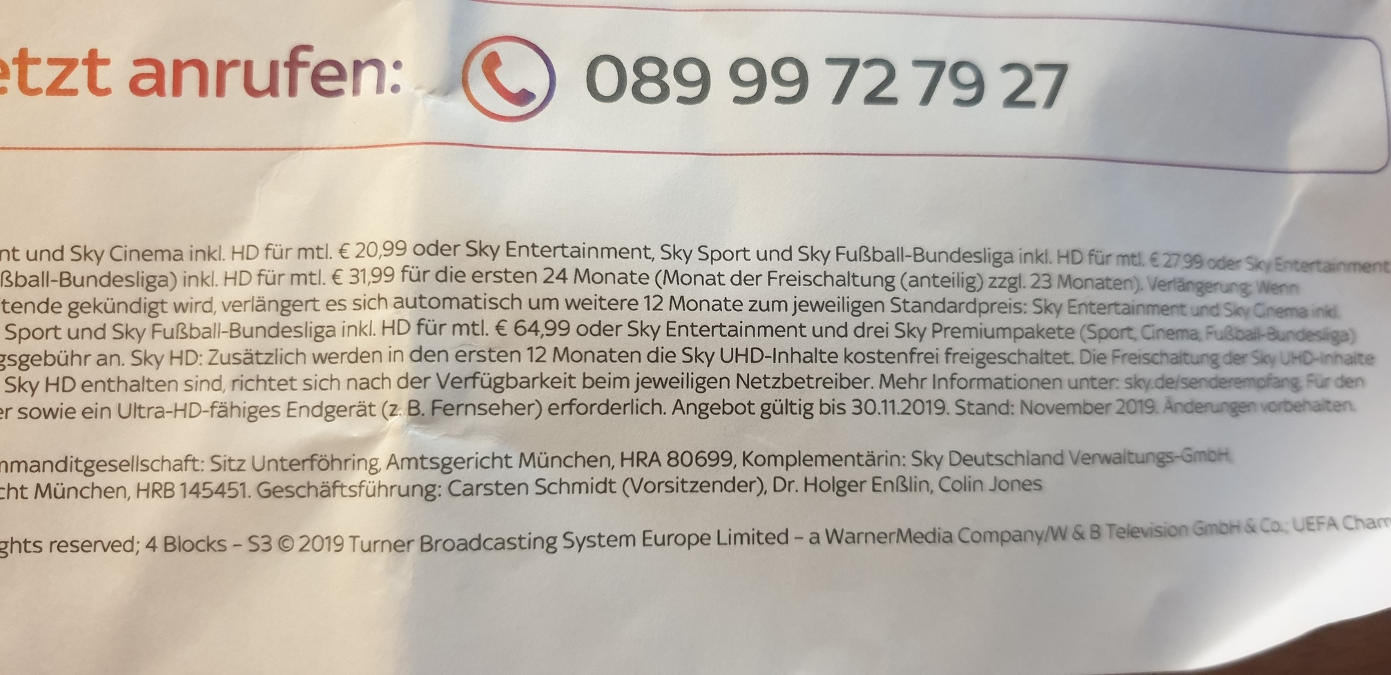 Das mit UHD nur für 12 Monate stand bei mir auch irgendwo im Kleingedruckten, obwohl es mit im Chat anders zugesagt worden war, auch SkyGo stand nicht dabei…